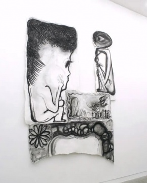 In her work, faces and figures are in a constant state of flux. Her charcoal drawing characters are