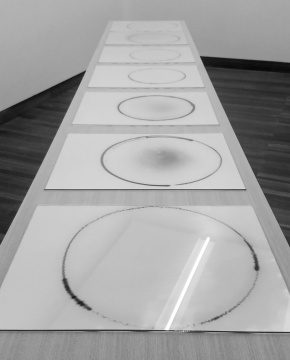 Bignia Wehrli’s works often employ measuring devices of the artist’s making to capture and transform ephemeral traces. One example is the photographic installation Sonnenzirkel (Solar Circle), where a typewriter case is adapted to produce a pinhole camera. Floating down the river, the case recorded traces of the sun’s relative motions on the photographic paper within, making manifest both the paradoxes and correspondences that exist between consistency and fluctuation.