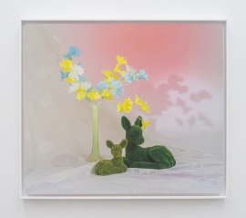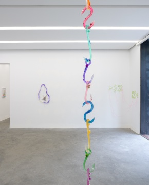 黄佩姗长期以摄影与图像作为创作起点,将社会生活中常见的符号、物质与意象,通过手工转化成柔性雕塑及综合材料装置。从云南乡村集市常见的装饰商品,到巴黎阳台国籍不详的瓶罐,再到杭州留和路的花儿围栏,记忆不断被新的能量刷新,但隐匿着的、对美的直觉,则在暗处驱使着一次次的想象和重构。她的创作悬浮于双重引力之间:人造物的冰冷精确与情感的潮汐节律。现实中的钩子,是人造物,是工具,是触手,是凶器,也是钥匙。对于艺术家而言,钩子作为捕获、悬挂、固定的物理延伸,体现人类的操控意志——弯曲的形状暗示对不可及之物的攫取欲。当钩子的形状被树脂封存为现世琥珀,其捕获功能遂告失效,沦为纯视觉符号,这种“失效的捕获”形成对权力装置的戏仿。艺术家通过封存人造物之形,用树脂构建了一座当代文明的考古现场:仿真植物的塑料脉络、电路板的金属神经、不锈钢的冷光骨骼,皆被凝固为人类世的微型化石,言说某种尚未命名的文化地层。